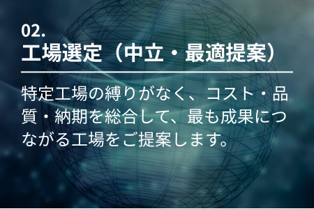 製品に最も適した工場を中立的に選び、品質・価格・リードタイムのバランスを最良化した生産ソリューションを提供します。