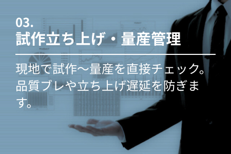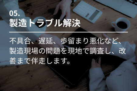 量産立ち上げ時の試作調整、金型トラブル、材料選定、工程管理など、海外製造で起きがちな問題に対し、現地の工場責任者レベルと即時コミュニケーションが可能。